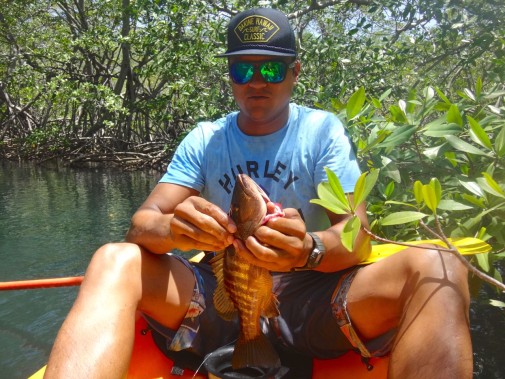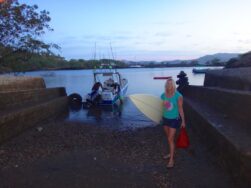 We paddled around the estuary, exploring its nooks and crannies while I spoke Spanish with Jaco and he baited lines for fish. Eventually, he caught a decent sized specimen, and we returned to the shore so that he could reconvene with his two companions. I paddled back out to the surf, and then to the boat, lest my friends think I had been eaten by crocodiles.