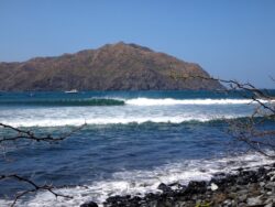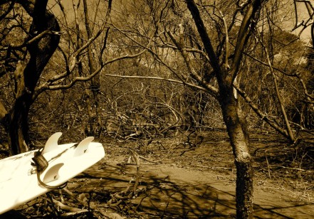Undeterred, I took a wave in to the beach and scrambled over the rocks onto shore, where I was confronted by dark, twisted trees covered with spiky thorns and engorged with blackened wasps nests. I tentatively inched my way into the arid jungle, curious what might lie deeper within its shadowy corners. Sharp, thorny branches punctured my bare feet. Giant horseflies and black wasps swarmed my skin, biting meanly through my rash guard. After only a few steps, I became overwhelmed and frightened, slapping frantically as I ran back to the relative safety of the ocean.