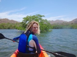 I spotted a kayak and waved happily, eager to cling to a lifeboat of familiarity in this hostile domain. It was a group of ticos from one of the boats, fishing for dinner. They said they had seen two small crocodiles just around the bend, that I should get in the kayak if I wanted to go exploring. Two of the men ascended the shore, and Jaco invited me to board the kayak with him. I gladly accepted. Once I was on the small boat, I felt much safer, confident that a crocodile would be less apt to attack a large piece of artificially colored plastic than two ripe, wiggling legs.