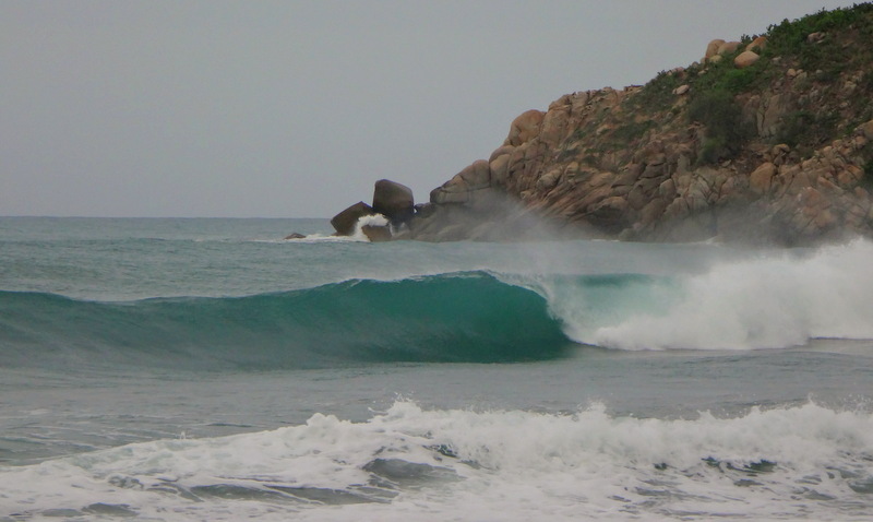 After I stopped to talk to Tyson, I crested the hill, and my unicorn reared up before me. Déjà vu, in a place I’d never been, except maybe in my dreams. Strange rocks piled up like jacks against the point, forming that unique, defining shape, almost like a check mark; a picturesque bay of aquamarine framed by palm trees; white sand punctuated by palapas. As soon as I set eyes on it, lines of waves began to file in teasingly, and though the tide was too high for them to break, I saw beyond what was, to what could be.