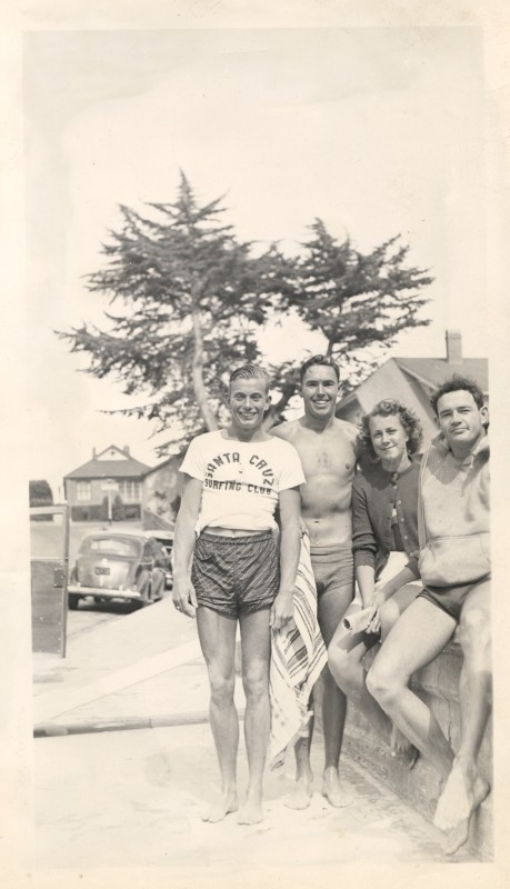 But women weren’t entirely absent from the scene. One pioneering woman, Pat Collings, would hang out with club members and borrow their boards to ride at Cowell Beach. She is one of two women that Mayo remembers surfing in 1941, and may have been one of the first women to ever surf in Santa Cruz. Collings later married Richard Fassio and changed her name to Pat Fassio. She still lives in the area, and spoke with me over the phone.