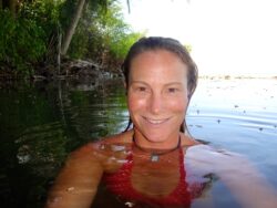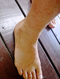 After we came in, we bumped back out on the road to look for Michelle’s place, Mil Flores. The name means “a thousand flowers,” and suited the land, rich with plumeria, hibiscus, coconut palms, and fruit trees. What a sweet relief to lay down in the soft pillow of this place, receive a warm welcome from a familiar face. My skin was red and swollen with mosquito bites (they were not deterred by my 25% DEET, wiggled through the holes in my mosquito net, and bit through my clothing; my bite relief creams proved worthless in relieving the itching); sand fly bites (which are unavoidable unless one avoids the beach, not gonna happen); and jelly fish stings (no more bikini in the surf, wear rash guard and shorts at all times, ok I got it now). How grateful I was to have a soothing place to heal and a reasonably good internet connection with which I could contact my medical advisors, Patty and Jen.