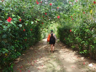 Pinnochio looked out of the windows with excitement as Nicole and I gave each other pep talks on overcoming nausea and tried not to throw up. We emerged briefly on a blessedly paved highway before turning down the sketchiest of all roads thus far, the road to Matapalo. A rough cut through the flesh of the jungle, the raw, jagged scar of a road looked like a fault line that had cracked apart during a powerful earthquake. Uneven stones were scattered through the jagged crater, providing enough texture to tease ambitious vehicles into passage. The jungle was making a brilliant effort to seal the wound, a scab of vines and hibiscus flowers draped over and alongside the road.