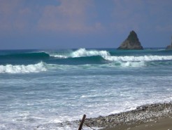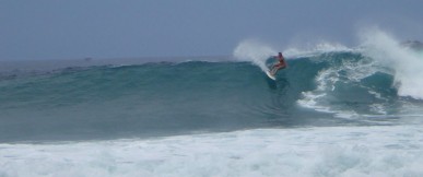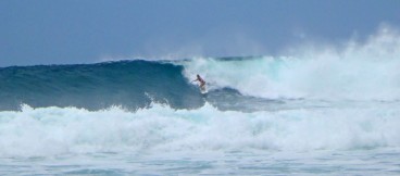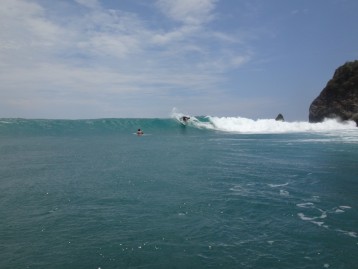 One of my most frustrating days gave birth to one of my most favorite. Michelle and I woke up early, frothing to surf the new swell that had arrived the previous day, and hurried down to take a look at the various surf breaks. After assessing our options, we decided to wait for the tide to improve at the main break. We checked it and rechecked it for several hours until it started to turn on, and eagerly headed out to an empty lineup. We had scarcely begun to paddle out when nearly 15 people stormed the beach. I watched apprehensively as the mayhem began to unfold. Michelle dropped in on a solid set wave, and a carelessly flung longboard went over the falls behind her, narrowly missing her as she shot down the line. This is getting dangerous, I thought. Moments later, I duck dove under a wave and surfaced to a violent crack on my forehead. Another board had hit me hard enough to break out the fin plugs. Luckily, I wasn’t bleeding. Stitches on the first day of the new swell would have certainly thrown a wrench in my trip. I struggled to catch a wave in, but I was in a bad mood, and I didn’t know the people or the break well enough to assert myself. I cheered Michelle on as she picked off a few more bombs.